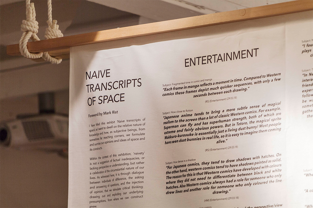 The exhibition comprises of two contents: analysis and proposal. Each exhibitor has teamed up with another to form a pair to start an in-depth analysis of one of the six themes and its influences in the European environment we inhabit. They exchange their knowledge, experience, and understanding through an interactive dialogue in order to develop a working brief for the final proposal. Contrary to previous years, the dynamics of the presenters involved are diversified, both in origin and profession, as we are driven by the desire to advocate wider and positively unpredictable conversations about the many cultures we encounter in the city of London.