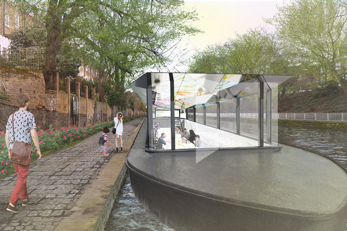 The inside of the ship is accessible for everyone to have tea and work together. Its ceiling is shaped like a mirror ball reflects activities inside the ship towards the outside so people walking along the canal can see inside and be attracted to it.
