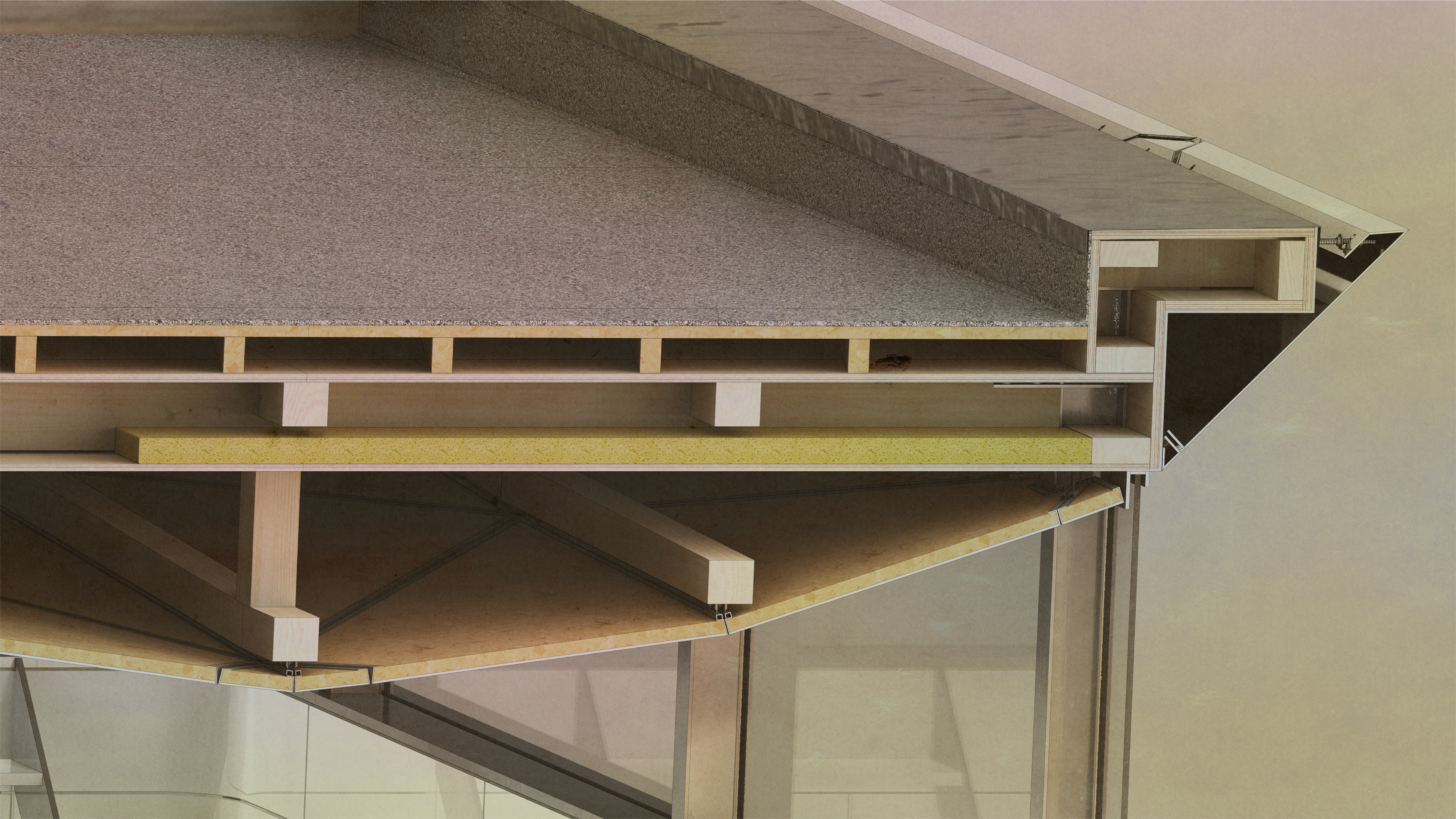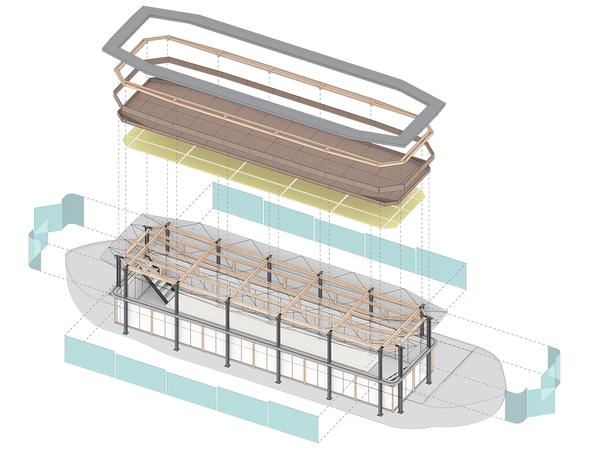 Every steel universal column on the ship is welded on the bottom and side of the ship which strengthen the framework. The roof structure is made of timber beams. The structure becomes light and stable as the spans of columns and ceiling boards are aligned.