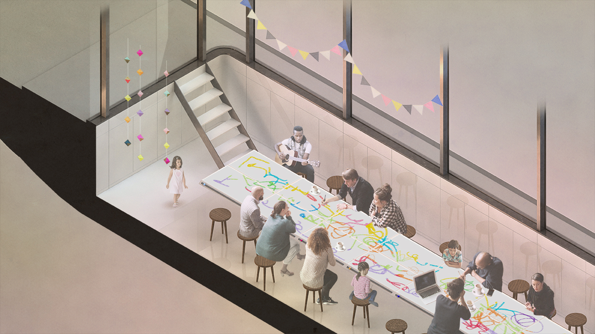 There is a long table installed in the middle of the ship which can be used for: working, drinking, and chatting. The table is made of magnetic drawing board on which people can easily draw and erase pictures and letters. This function of the table encourages people to encounter and communicate. There is no additional cost to maintain and keep resources for the table as magnetic pens and magnetic coffee cups are used as drawing tools which do not require ink and dust.